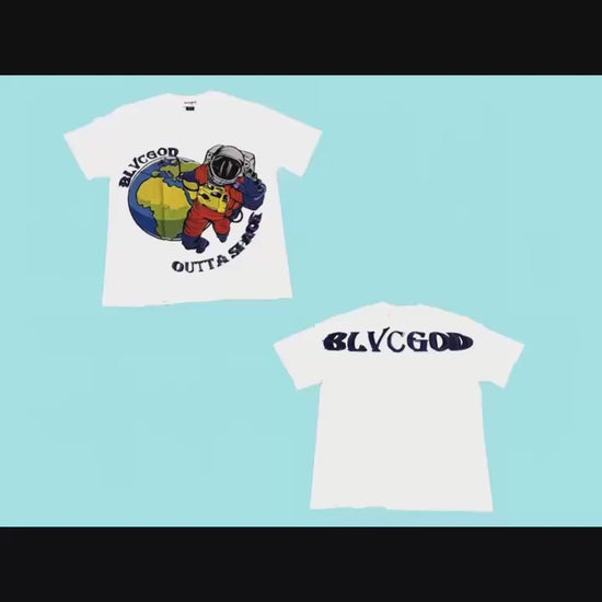Drip that's out of this world. The BLVCGOD OUTTA SPACE TEE takes your style to another dimension with a bold front graphic featuring the iconic BLVCGOD astronaut floating above Earth—arm outstretched, reaching for the stars. On the back, BLVCGOD is printed from arm to arm in a clean, commanding design that speaks volumes from every angle. This tee blends cosmic vision with street-level energy.